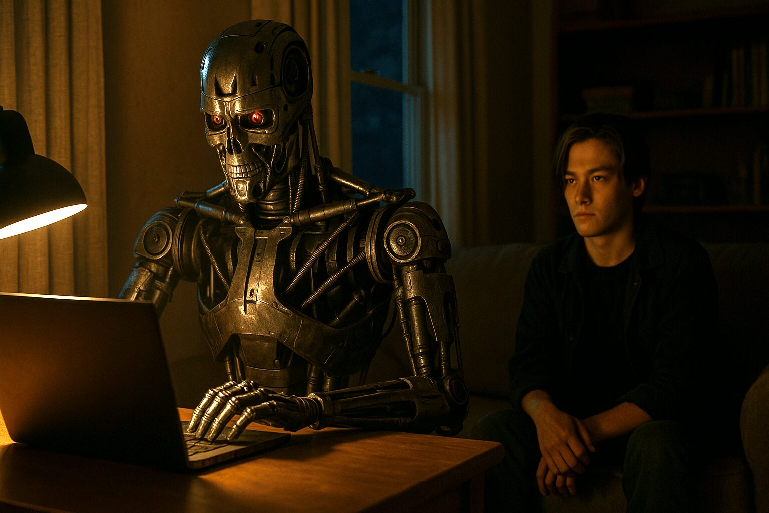 umelá inteligencia vo fotografii terminátor píše blog John Connor sa v pozadi prizera